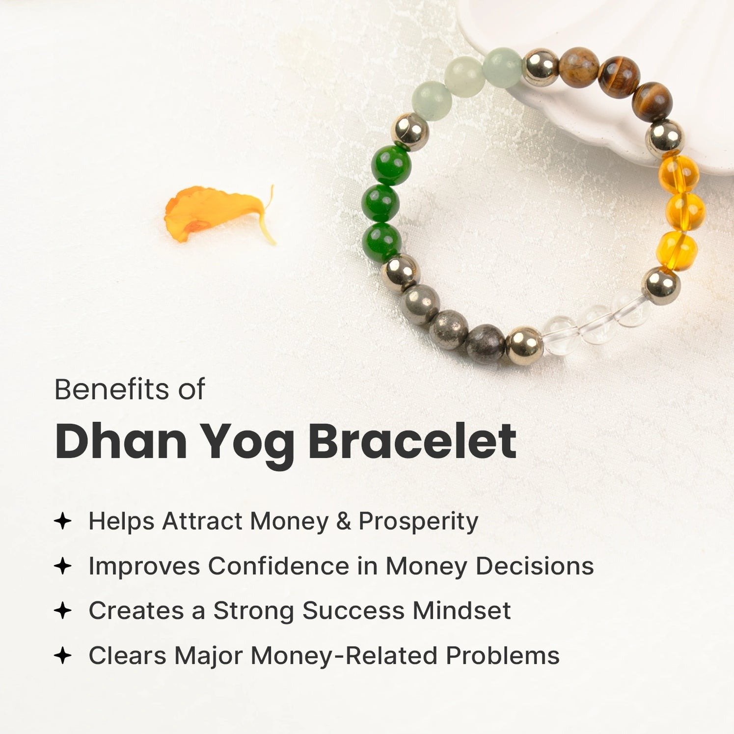 The Dhan Yog Bracelet helps enhance career growth, business success, and good fortune using powerful crystals.